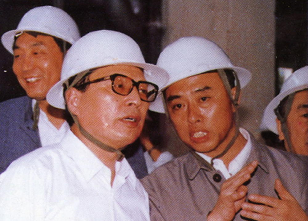 1988年5月16日,中共中央政治局常委、纪委书记乔石(左一)在省委书记、省长卢荣景的陪同下,莅临公司视察。